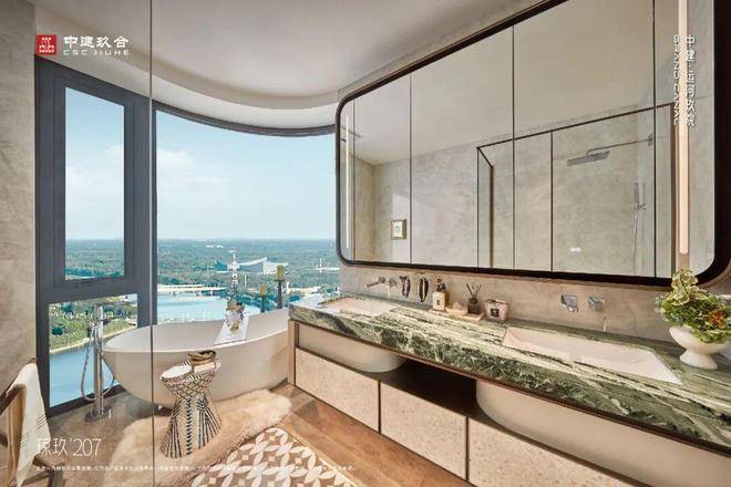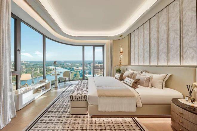 最宽约19米环幕视野,采用转角无柱前卫构造,端厅+主卧双面采光,270°揽尽运河与都邑天际线。