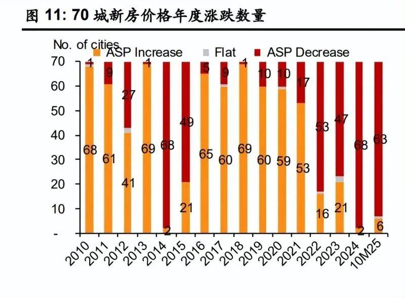 遵循邦度统计局数据,2025 年 10 月,70 大中都市中有 64 个都市新筑商品室庐价 格环比下跌,自 5 月此后从来保卫正在 50 以上的高位。2025 年 1-10 月,共 63 个 都市新筑商品室庐价值累计下跌,仅 6 个都市累计上涨,较 2024 的 2 个都市有所 增众。 70 城新房价值 10M25 累计下跌 2.4%,较 2024 年的-5.9%跌幅显明收窄, 三线都市仍旧为厉重拖累(累计下跌 3.1%),一、二线.5%大幅收窄,几近企稳。